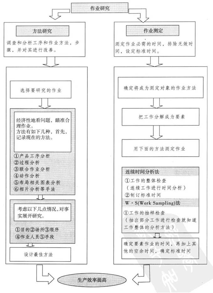 明睿管理咨詢通過在日常企業中活用的手法為中心來說明IE,大致地整理了一下IE,它有如下圖所示的方法研究和作業測定兩個方面構成。