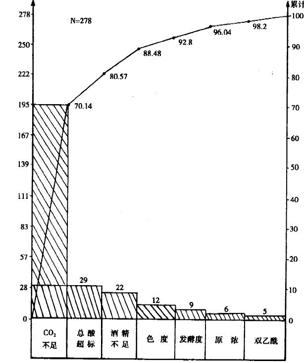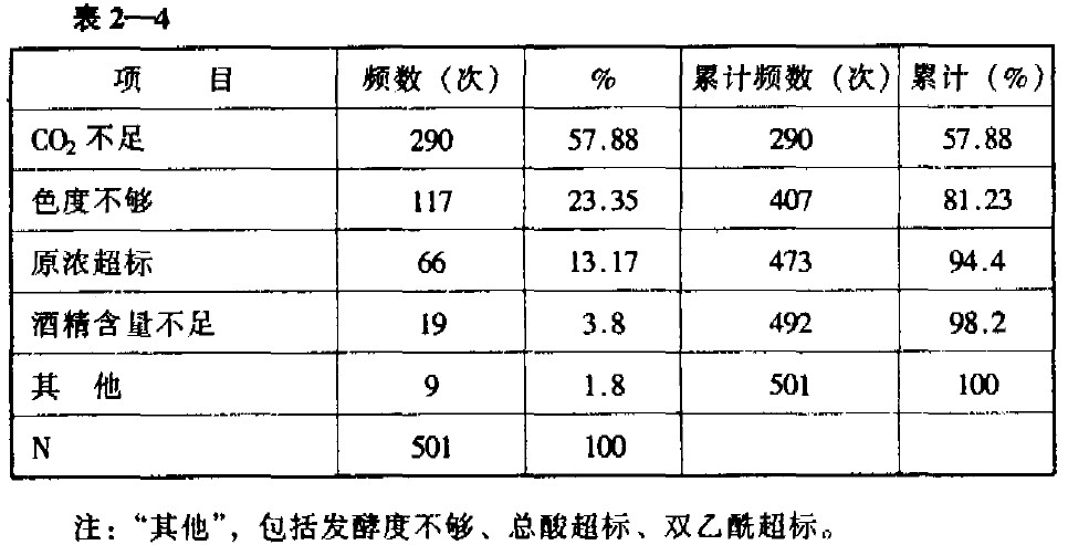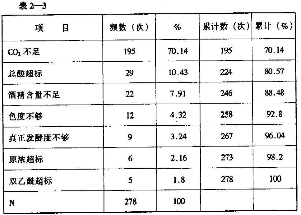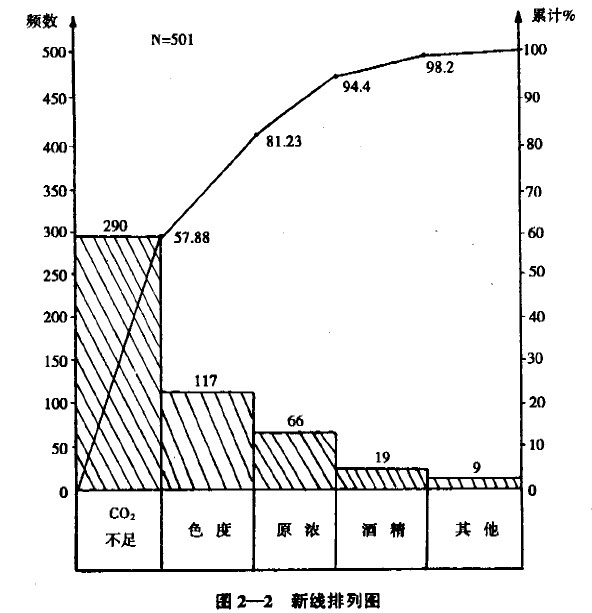 注:雙乙酰未全檢。將表中數據繪制成圖2-1的排列圖。
