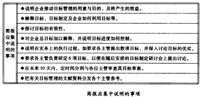 為使各部門主管對目標管理更為熟悉,了解并完全接受這一管理制度,應召集各階層、備部門主管舉行簡報會議。為使簡報內容更具針對性,最好每一組所包括的主管級別相同,例如一組為高層決策主管階層,一組為參謀部門主管階層,一組為業務部門主管階層。在簡報時,應集中說明以下事項: