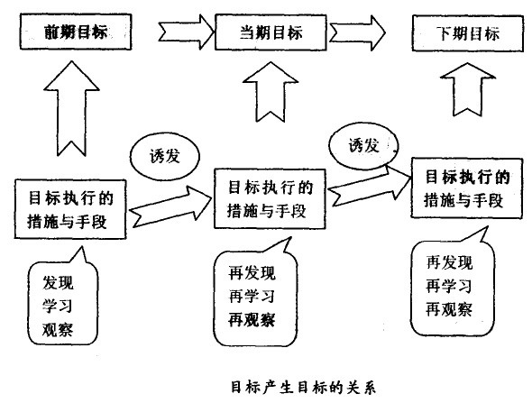 達成當初所設定的目標,是推行目標管理必須做到的。但是,如前面所說,由于各種不確定因素的影響,當期目標不一定就能在當期實現,這就需要我們把它作為下期目標的經驗教訓,學習制定更適合的目標執行措施與手段,以便下期目標的制定更具有效性。因此,這并不完全是件壞事,它可以使我們更高、更深地向目標的本質靠近。另外,即使當期目標在當期就達成了,那也并不就意味著目標管理結束了,因為從一個目標到另一個目標,它們之間在時間上是順延的,它還關系著下一個目標的開始。下面的示意圖清楚地顯示了目標產生目標的關系。