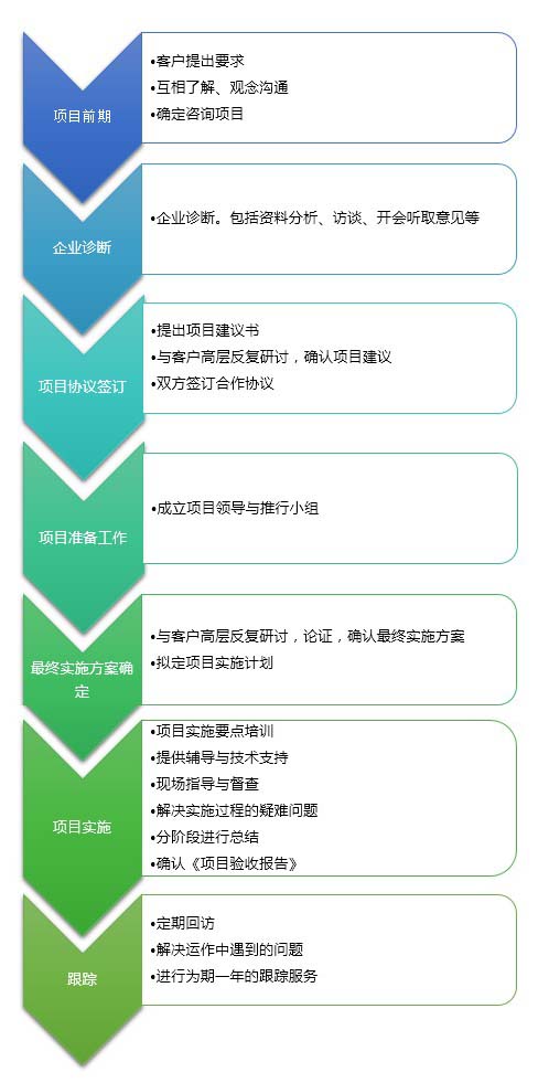 明睿公司根據(jù)10多年來為企業(yè)提供項(xiàng)目咨詢服務(wù)的經(jīng)驗(yàn)制定了一套成熟的項(xiàng)目咨詢的操作流程體系,我們大致將流程分為:項(xiàng)目前期、企業(yè)診斷、協(xié)議簽訂、準(zhǔn)備工作、確定方案、項(xiàng)目實(shí)施,跟蹤服務(wù)這幾個(gè)大部分,具體請(qǐng)看下圖: