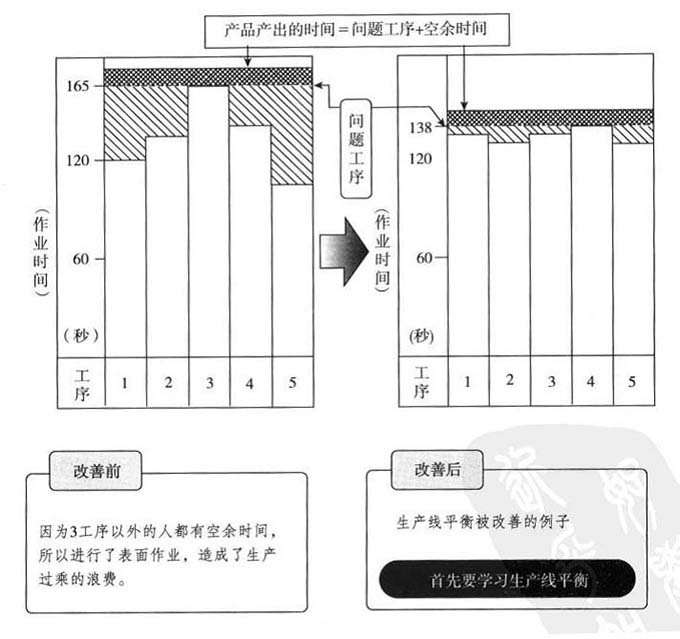 如果生產線不平衡,從工序2流傳來的半成品停滯在下圖(改善前)所示的工序3,在工序5就會發生停工等待。這樣,工序3的作業人員就會手忙腳亂,負荷不斷加重,疲勞感也會變得沉重,作業時極易發生錯誤。