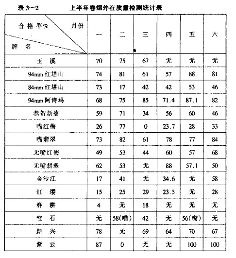 表3-1為1989年上半年各主要牌名卷煙外在質量合格率分月統計表。從表中可以看出,被判為外在質量不合格的卷煙批在總抽檢批中所占的比重是比較大的。