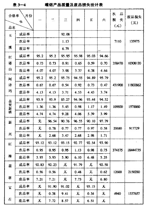 三個車間的次品率原則上接近計劃指標,而廢品率均超出指標。四車間以生產甲級嘴煙為主,廢品率相對較低,六、八車間是生產乙級嘴煙的主要車間,廢品率相對較高。
