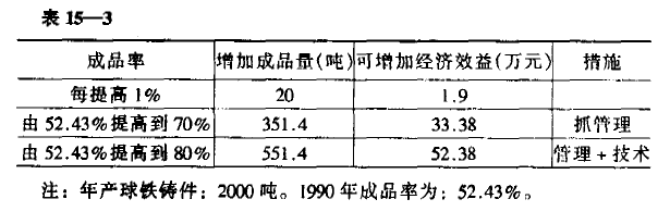 通過加強各項管理工作以及熔煉設備的更新,先進造型工藝技術的采用,可使該廠球鐵鑄件成品率得到大幅度提高,獲得更高的經濟效益,預測結果見表15-3。