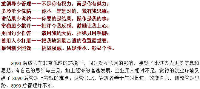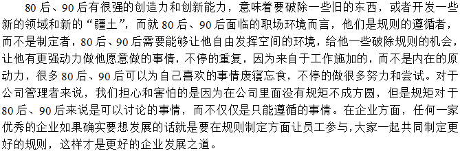 下面我們來看一下萬科集團對新一代員工的管理方法,萬科集團80后員工比例就達到了48.7%,以后將會有更多的8090后員工進入萬科集團工作。萬科的管理方式非常順應新一代員工的需要,幾乎是“員工需要什么,就給他們什么”,有準備的適應和引導他們的行為。在新一代員工管理上做到: